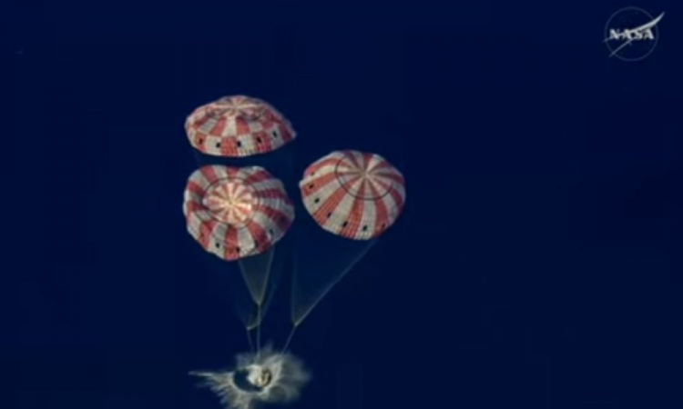 A velocidade para entrada na Terra foi de aproximadamente 40.000 km/h. Astronautas agora aguardam na água para serem içados de helicóptero, procedimento que deve acontecer dentro do prazo de uma hora.